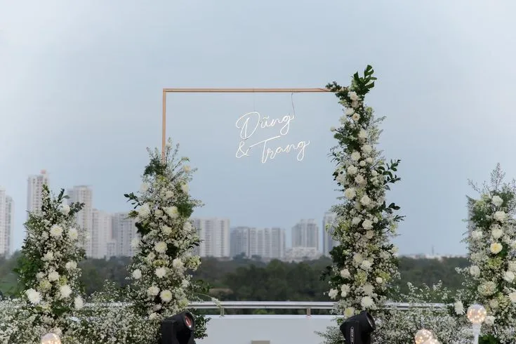 Thiết kế cổng cưới từ các hình khối độc đáo như hình tròn hoặc hình chữ nhật. Sự sáng tạo trong hình dáng sẽ tạo nên điểm nhấn thú vị cho bức ảnh.