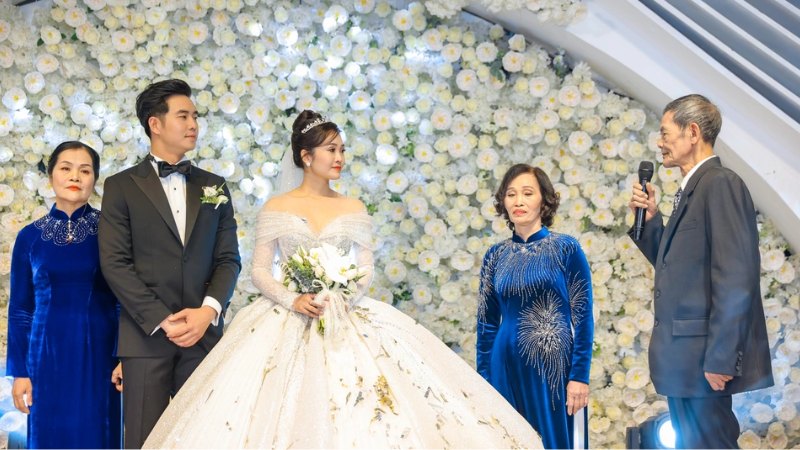“Xin chào các vị khách quý. Hôm nay, tôi rất vui mừng và tự hào khi thấy con gái mình đã tìm thấy một người bạn đời tuyệt vời. Ký ức về những ngày tháng ấu thơ của con gái tôi luôn là một phần quan trọng trong cuộc đời tôi. Tôi xin chúc cho các con sẽ luôn yêu thương, chăm sóc và hỗ trợ nhau trong mọi bước đường.”