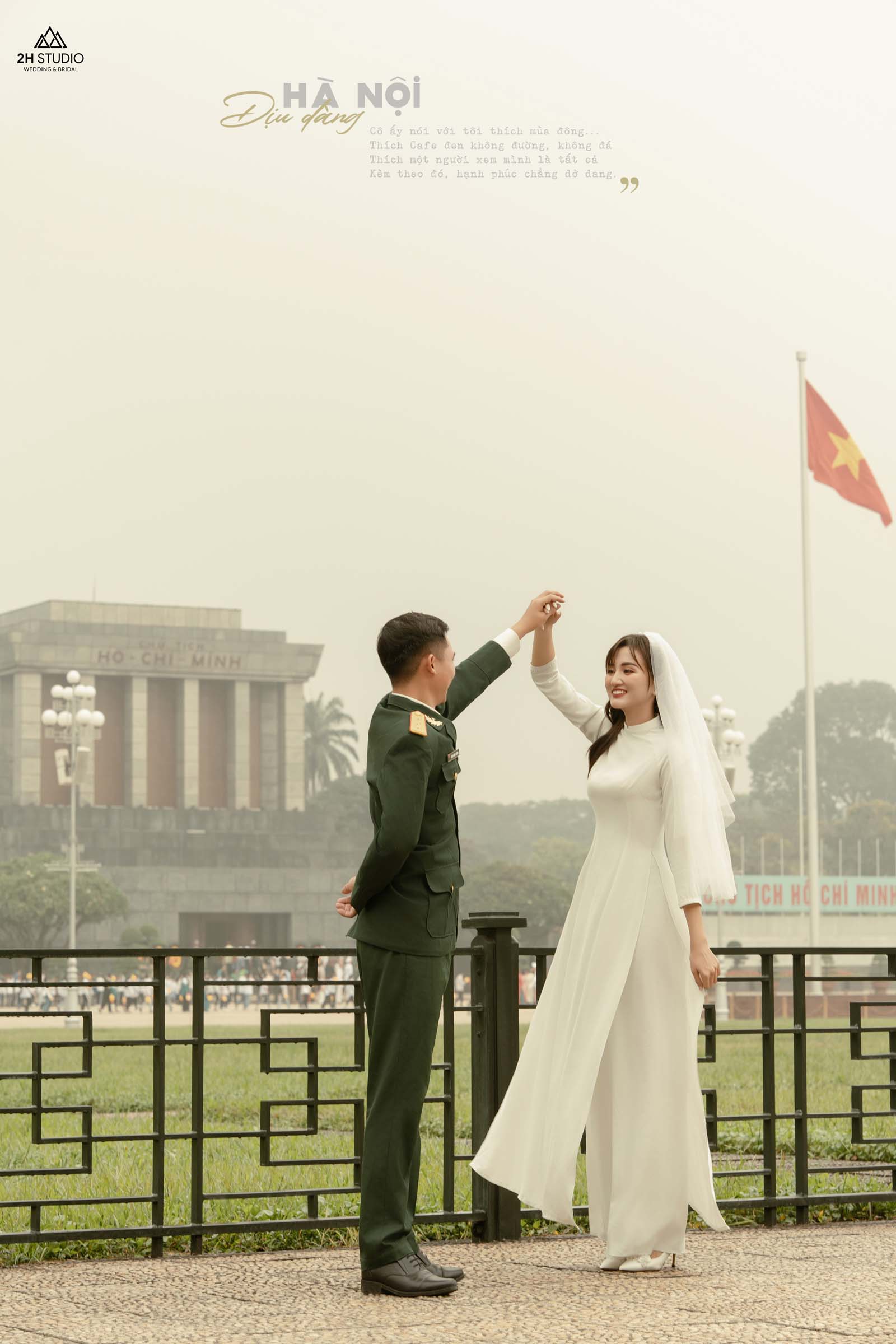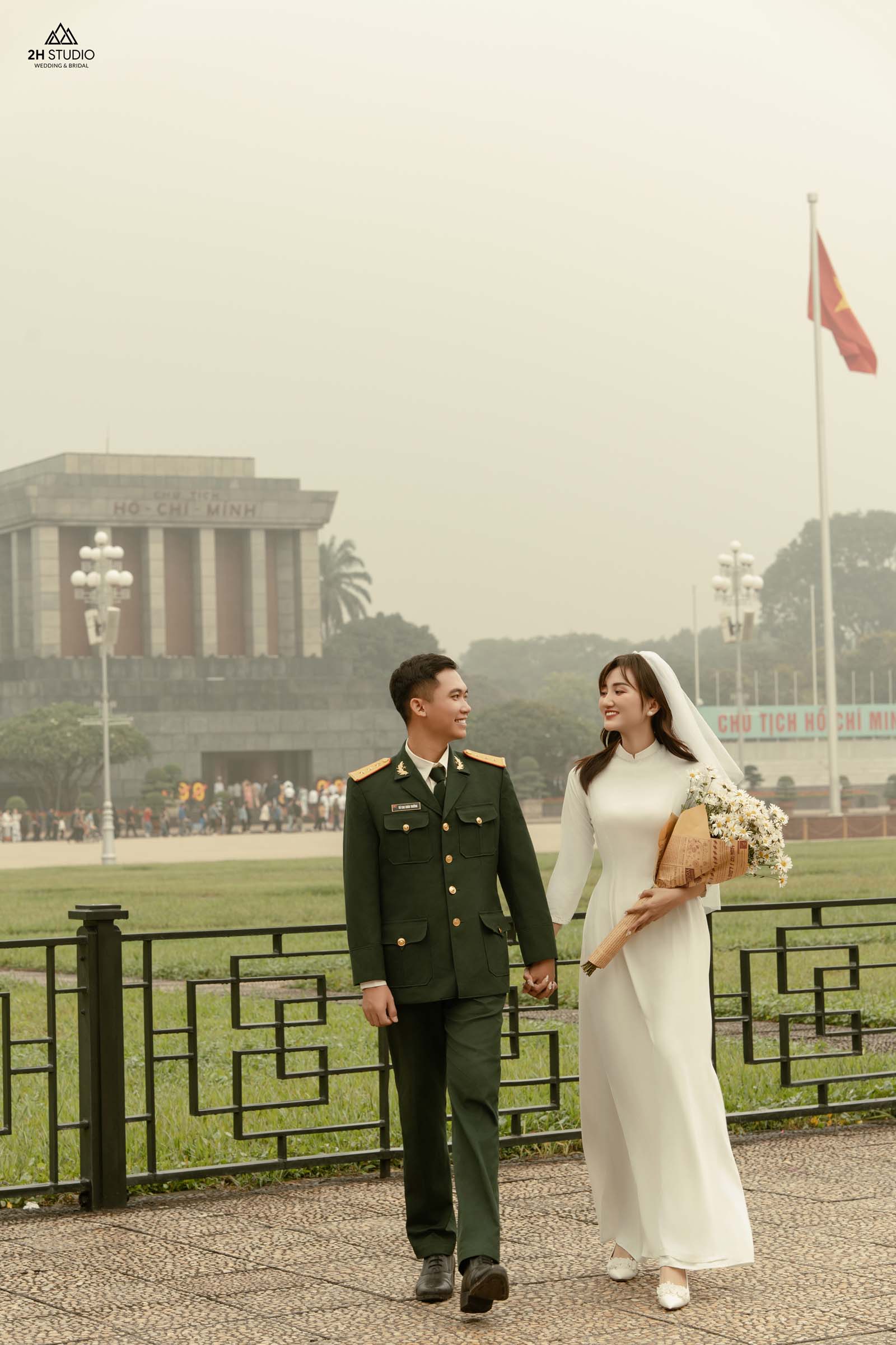 Sự kết hợp giữa quân phục nghiêm trang của chú rể và áo dài dịu dàng của cô dâu mang đến sự hài hòa, tôn vinh vẻ đẹp truyền thống và hiện đại. Phù hợp với những bộ ảnh mang phong cách nhẹ nhàng, lãng mạn nhưng vẫn thể hiện niềm tự hào nghề nghiệp.