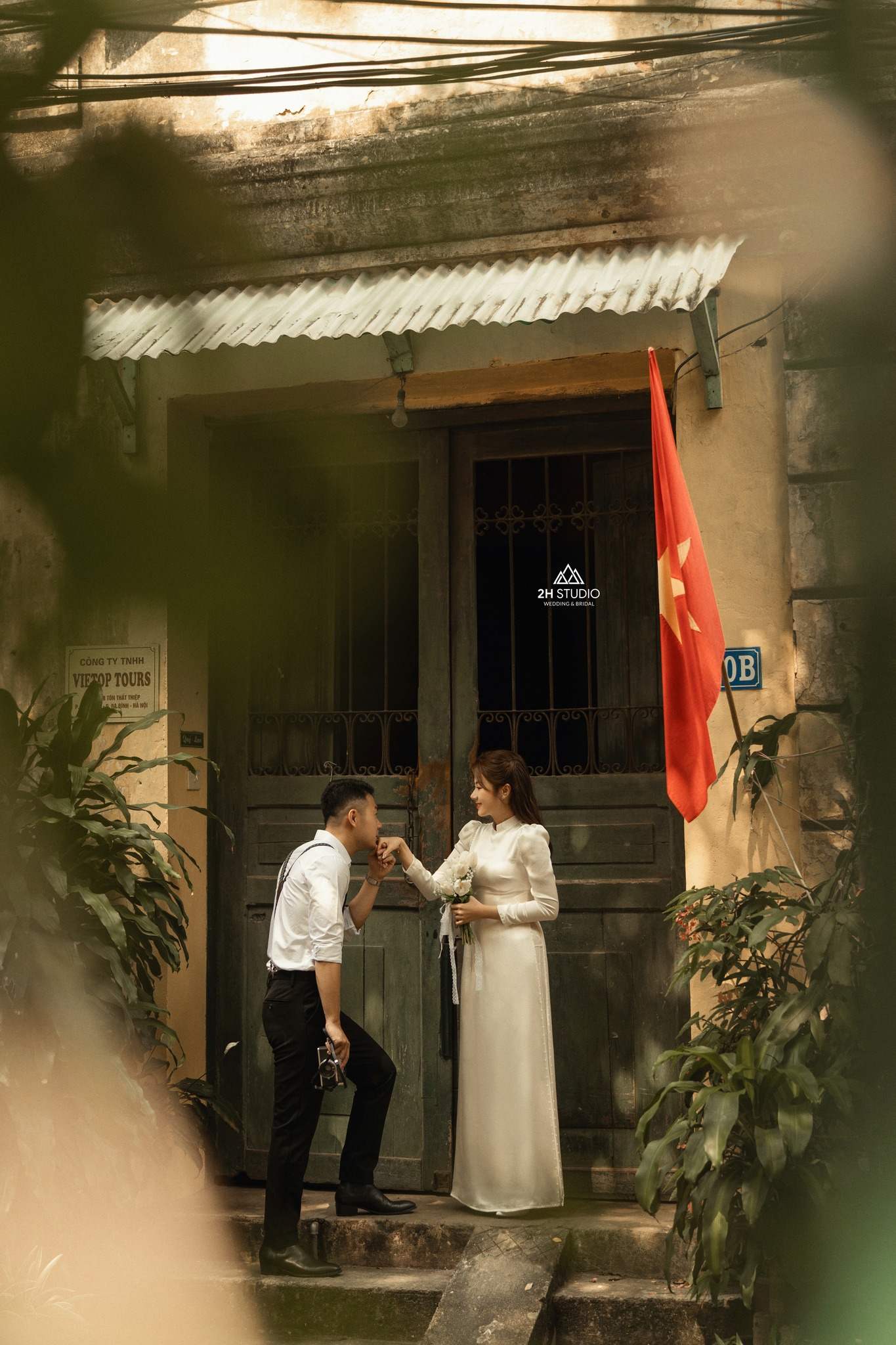 Khu phố cổ Hà Nội với những con phố nhỏ, mái ngói cổ kính, cửa sổ gỗ, và các ngôi nhà mang đậm dấu ấn lịch sử sẽ là bối cảnh tuyệt vời cho ảnh cưới ngày xưa. Đặc biệt vào mùa thu, với lá vàng rơi, không gian sẽ càng thêm lãng mạn.