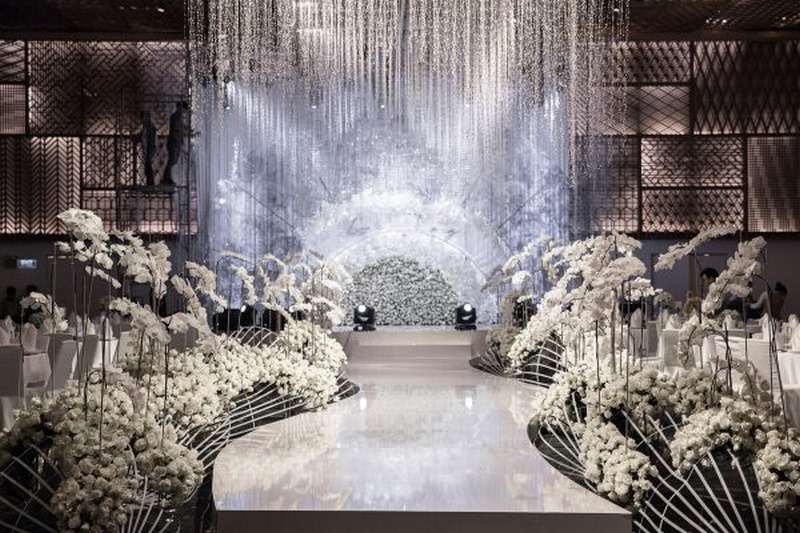 - Đông: Khi thời tiết trở nên lạnh hơn, tone màu trắng, xanh navy, xám bạc hoặc ánh kim sẽ tạo nên vẻ tinh khôi, thanh lịch và cực kỳ hiện đại, phù hợp cho các tiệc cưới sang trọng.