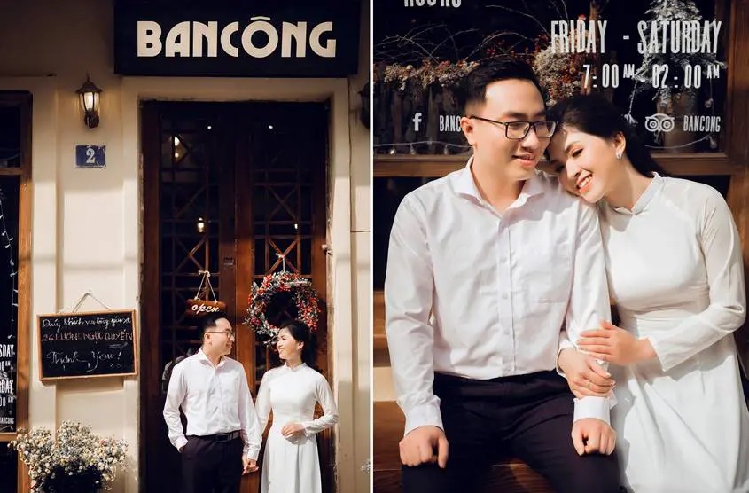Nếu bạn yêu thích phong cách hoài niệm, quán cafe chụp ảnh cưới ở Ban Công Cafe sẽ là điểm đến tuyệt vời. Quán được trang trí với bàn ghế gỗ cũ, khung tranh cổ, những mảng tường loang màu thời gian, gợi lại cảm giác Hà Nội xưa.