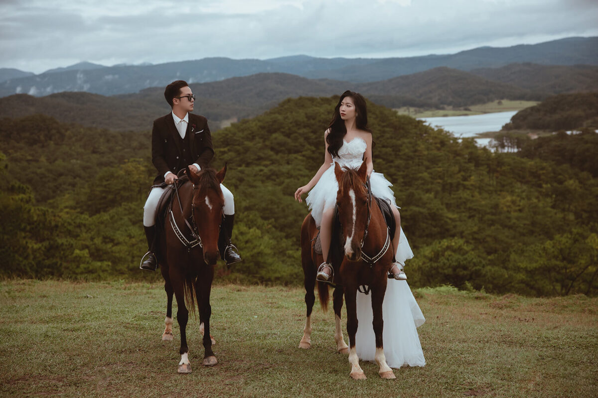 • Thời điểm chụp đẹp nhất: Sáng sớm hoặc chiều hoàng hôn là thời gian lý tưởng để có ánh sáng mềm mại, trong trẻo, tôn lên bố cục và thần thái của cả cô dâu – chú rể lẫn chú ngựa.