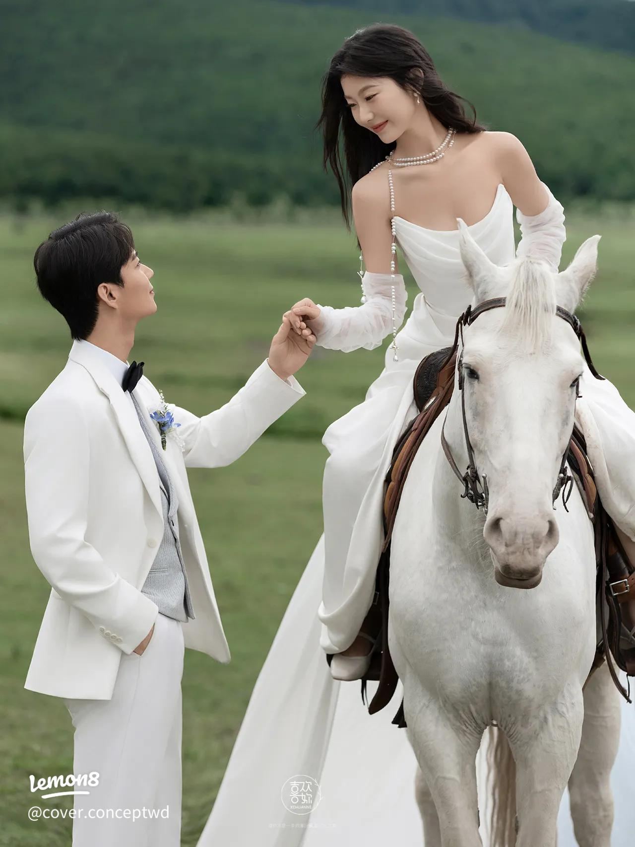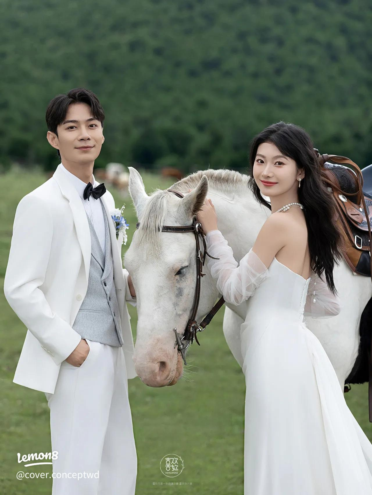 Trang phục satin trắng kết hợp vest đen bên cạnh chú ngựa trắng hoặc nâu giúp tạo nên khung hình đậm chất Âu, tinh tế và thời thượng. Những địa điểm như đồi cỏ, resort hoặc farm phong cách Tây sẽ làm tăng chiều sâu cho concept. Concept này phù hợp với các cặp đôi muốn bộ ảnh cưới vừa đơn giản vừa đẳng cấp.