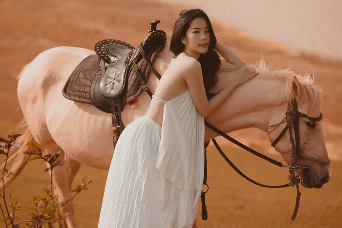 Với phong cách tối giản, bộ ảnh tập trung vào thần thái và cảm xúc qua những góc chụp close-up cùng ngựa. Trang phục thanh lịch giúp tổng thể vừa hiện đại vừa tinh tế. Concept này đặc biệt phù hợp với studio ngoại cảnh tối giản hoặc cánh đồng rộng có ánh sáng đẹp.