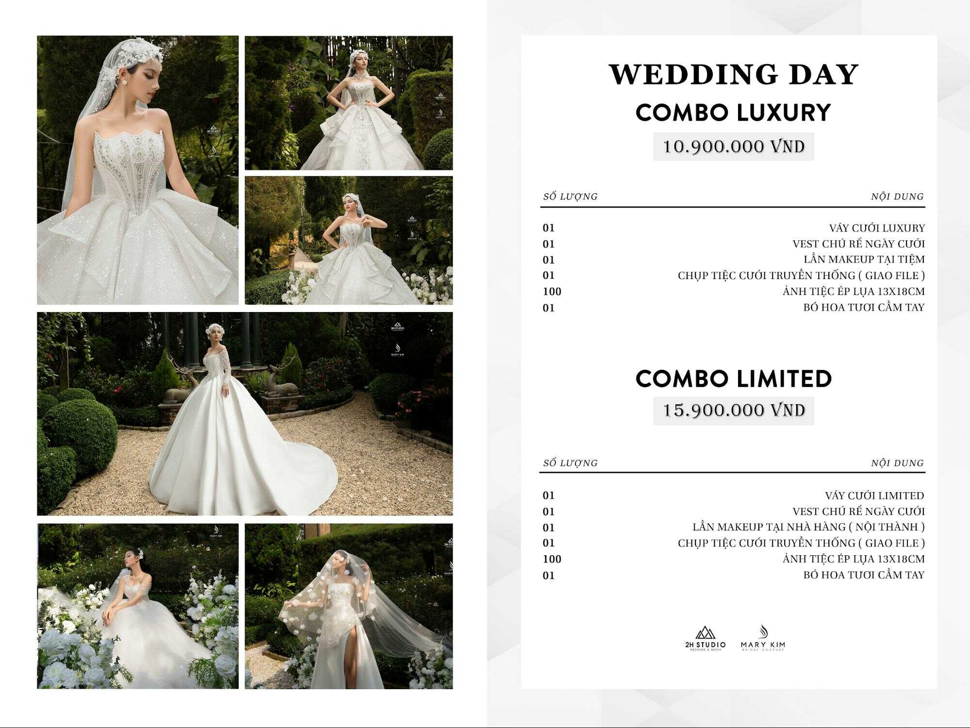 Hiện tại, 2H STUDIO đang có hai gói được nhiều khách hàng lựa chọn: combo Luxury giá 10.900.000 VNĐ và combo Limited giá 15.900.000 VNĐ. Khi sử dụng combo không chỉ giúp bạn giảm đáng kể giá thuê vest chú rể mà còn đảm bảo sự đồng bộ tuyệt đối về mặt thẩm mỹ cho cả cô dâu và chú rể trong ngày trọng đại.
