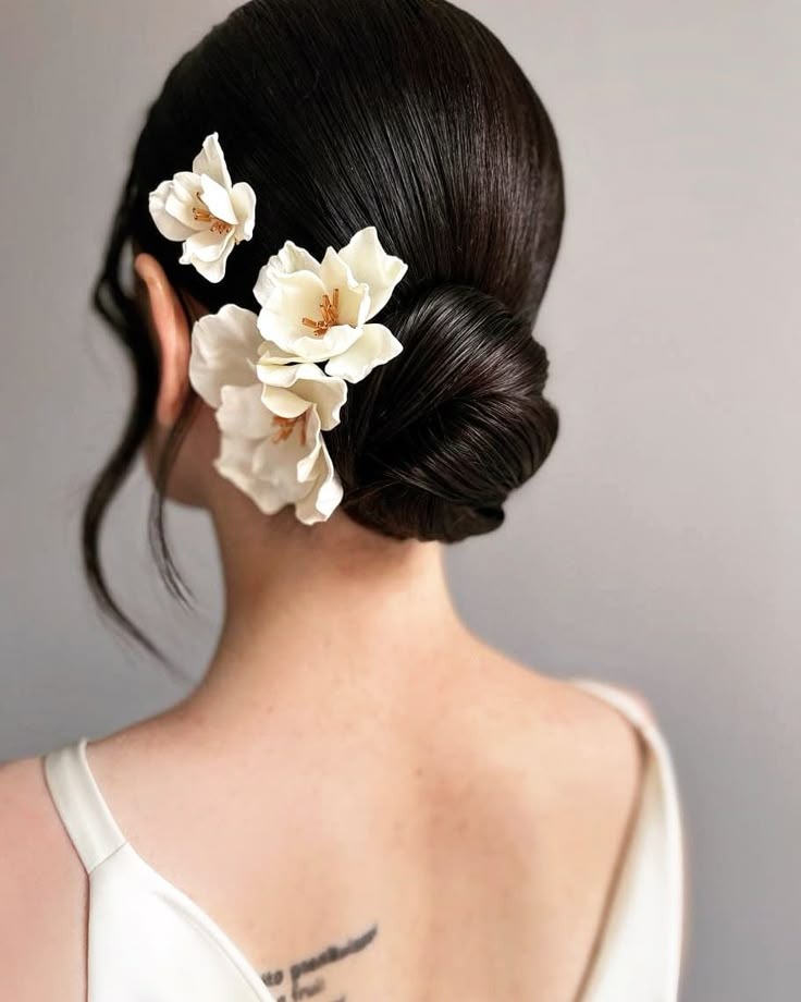 Tóc búi thấp giúp tôn lên đường nét thanh tú và cân đối, mang lại sự nhẹ nhàng nhưng không kém phần sang trọng. Để tăng thêm phần cuốn hút, cô dâu có thể điểm xuyết bằng vương miện nhỏ, kẹp hoa hoặc trâm cài đá – những phụ kiện giúp tạo điểm nhấn tinh tế, làm nổi bật phong cách riêng.