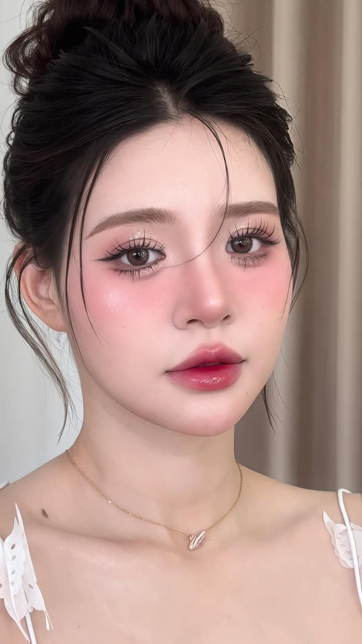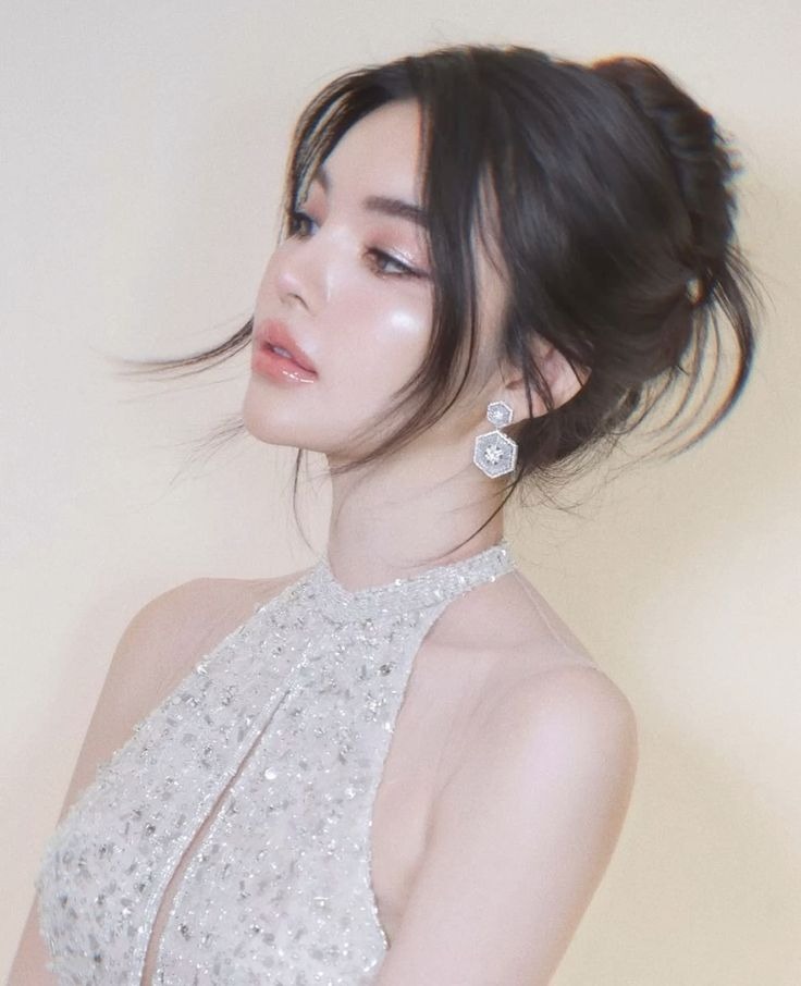 Kiểu tóc này được búi gọn ở phần gáy, kết hợp cùng các lọn tóc uốn nhẹ thả rơi tự nhiên, tạo nên tổng thể hài hòa và uyển chuyển cho khuôn mặt – đặc biệt phù hợp với dáng mặt tròn.