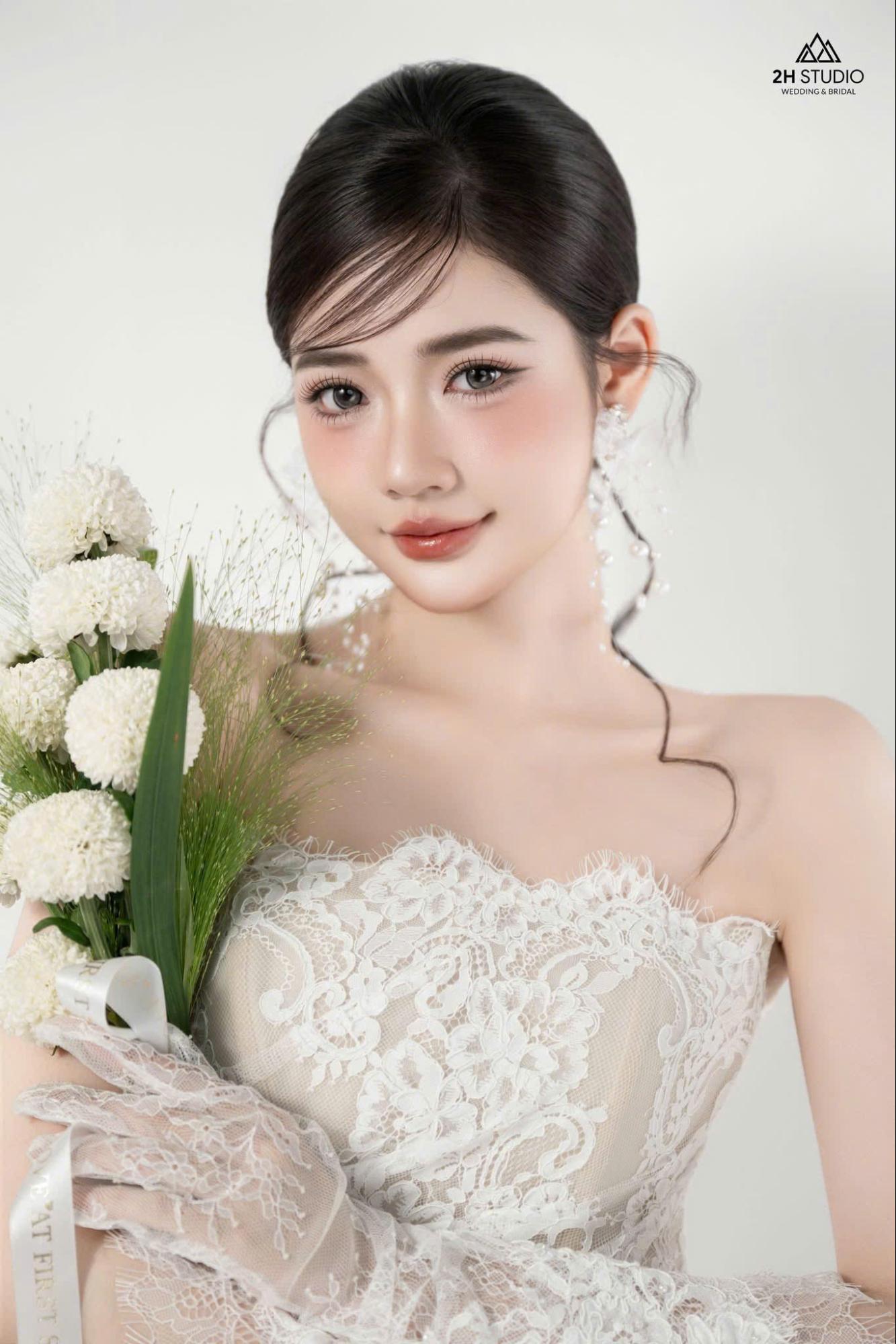 Kiểu tóc búi cao tiếp theo là tóc cô dâu mái bằng búi cao. Trong các kiểu tóc cô dâu để mái thì tóc cô dâu mái bằng giúp che khuyết điểm trán cao rộng tốt nhất.
