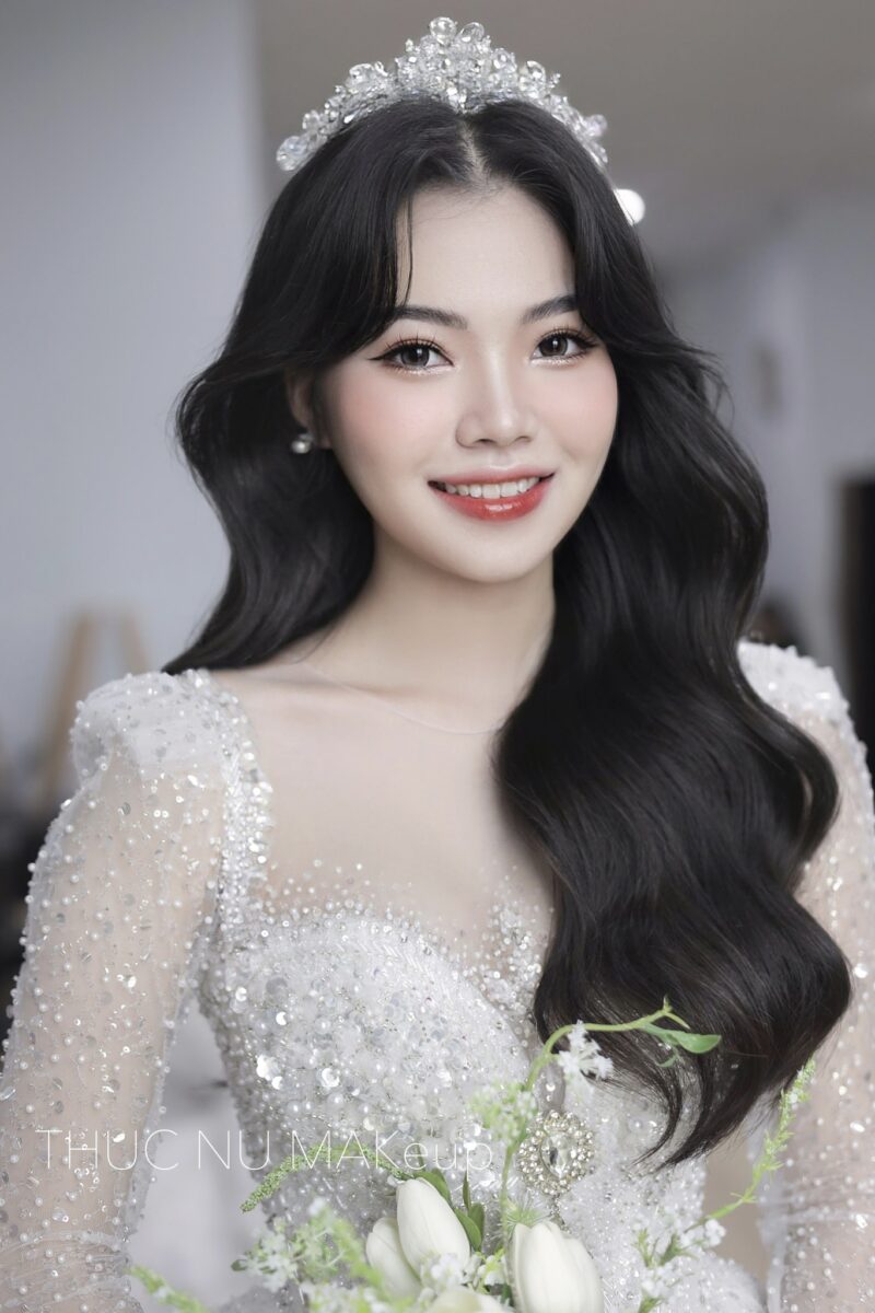 Mẫu tóc dài xoăn nhẹ rẽ lệch ngôi đội vương miện đẹp cho dâu
