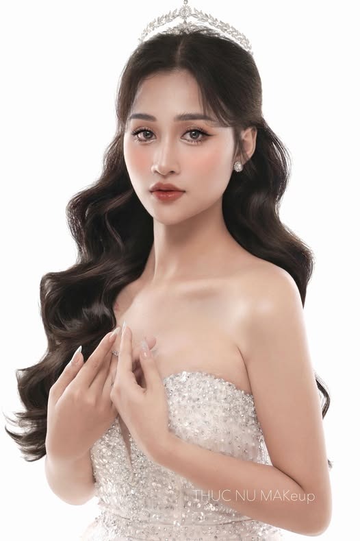 Kiểu tóc cô dâu xoăn sóng nước xõa tự nhiên đội vương miện