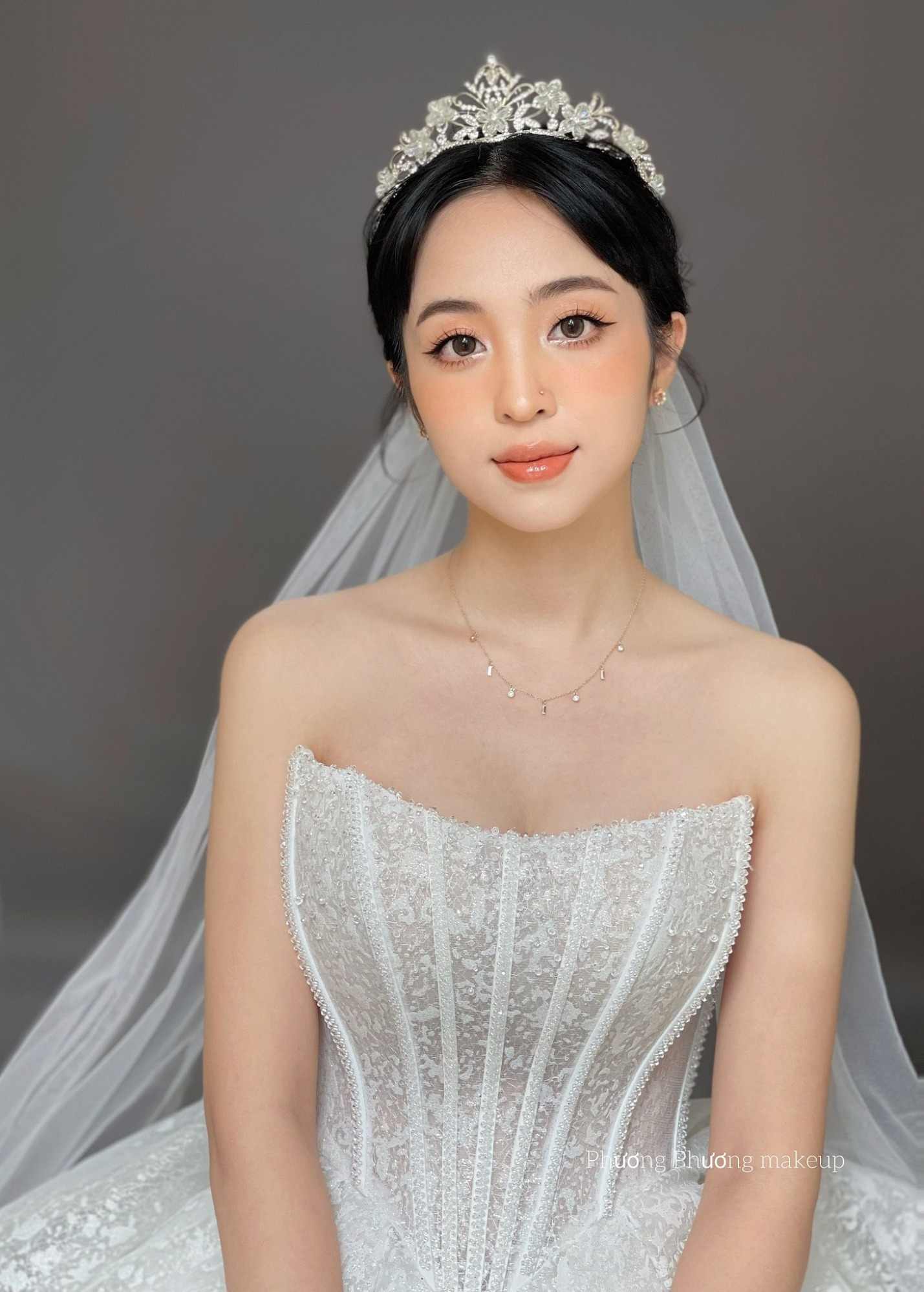 - Kiểu tóc đội vương miện tôn lên vẻ đẹp, ưu điểm trên khuôn mặt của cô dâu, nhất là phần trán, gò má. Nhờ đó, giúp khuôn mặt cô dâu trông hài hòa, thanh thoát và quyến rũ hơn.