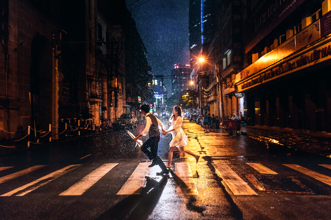 Đường phố trong mưa với ánh đèn vàng phản chiếu trên mặt đường ướt sẽ tạo nên khung cảnh lung linh, huyền ảo cho bức ảnh cưới. Ngoài ra, những không gian rộng và thoáng sẽ giúp giọt mưa trở thành phông nền tuyệt đẹp.Không nhất thiết phải đứng giữa cơn mưa, bạn vẫn có thể tận dụng mái hiên, ban công hay sân nhà để lấy khung trời mưa phía sau làm điểm nhấn cho bức hình.