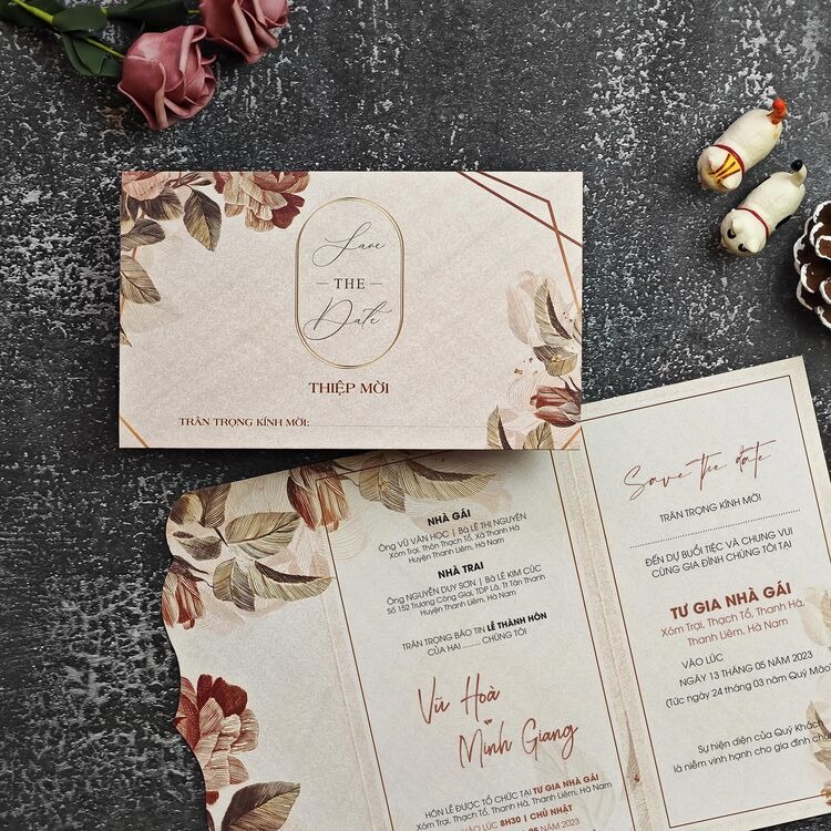 Khác với thiệp cưới, thiệp báo hỷ thường mang nội dung thông báo: “Chúng tôi đã tổ chức lễ cưới tại [địa điểm]. Nay xin trân trọng báo hỷ và mời quý vị đến dự tiệc chung vui cùng gia đình.”