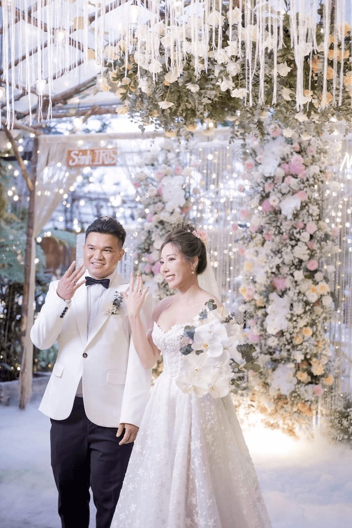 - Tự làm backdrop bằng hoa giấy, vải lụa, hoặc tấm rèm treo có in tên cô dâu – chú rể.