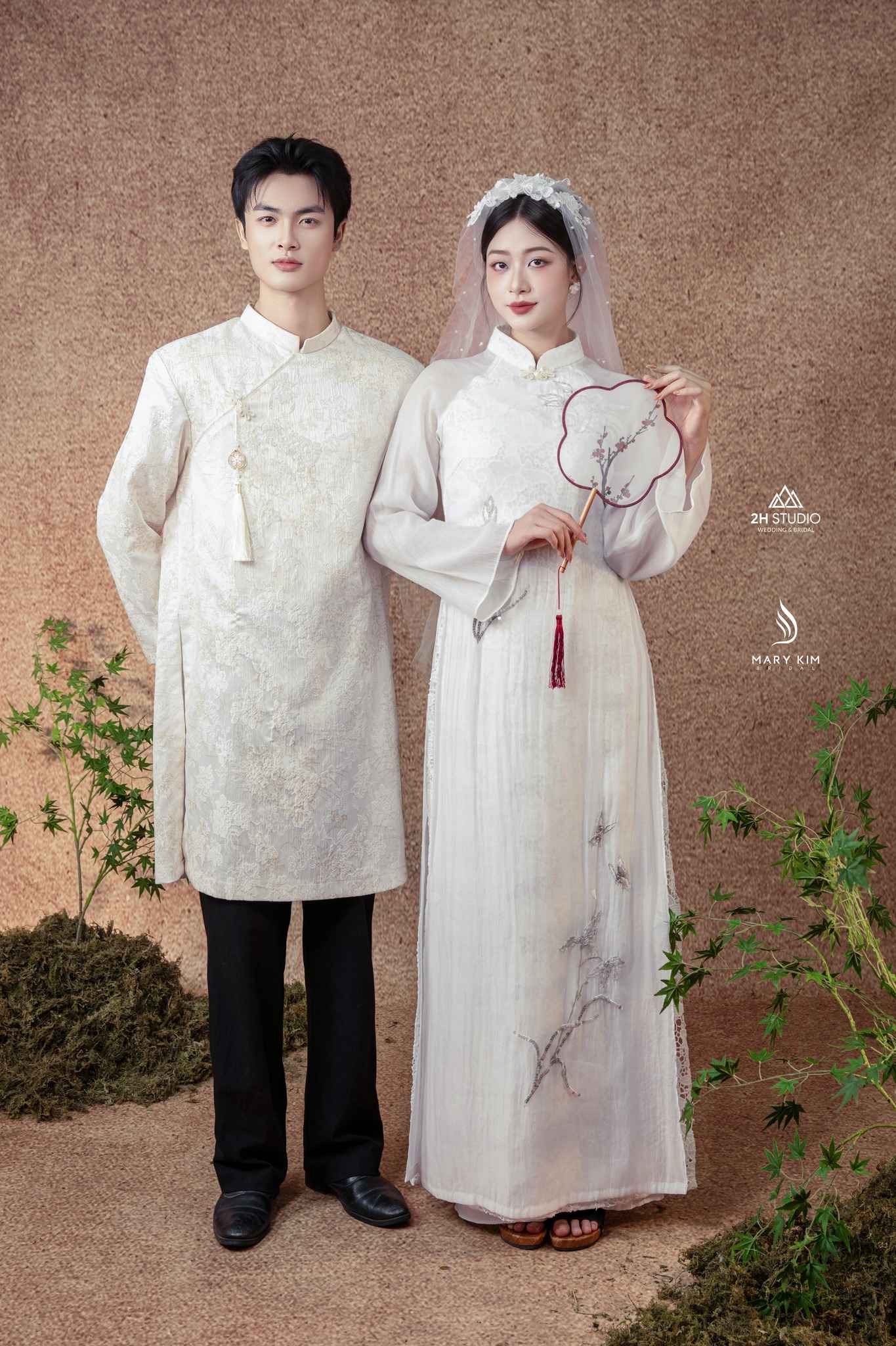 Nếu cô dâu chọn áo dài, chú rể nên phối áo dài nam đồng điệu về màu sắc và chất liệu. Đây là cách thể hiện sự hòa hợp giữa hai người, đồng thời giữ trọn nét đẹp truyền thống Việt Nam.
