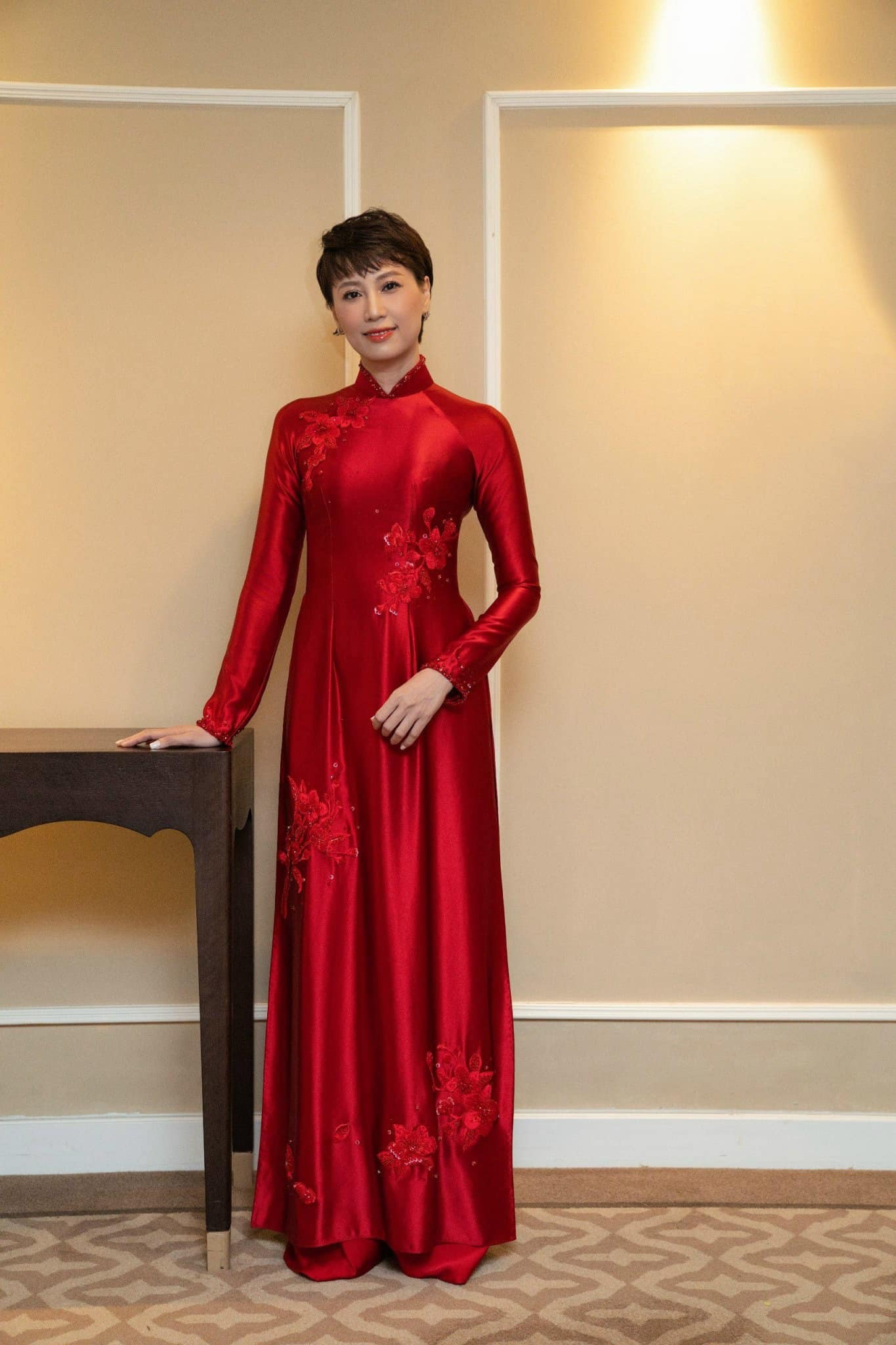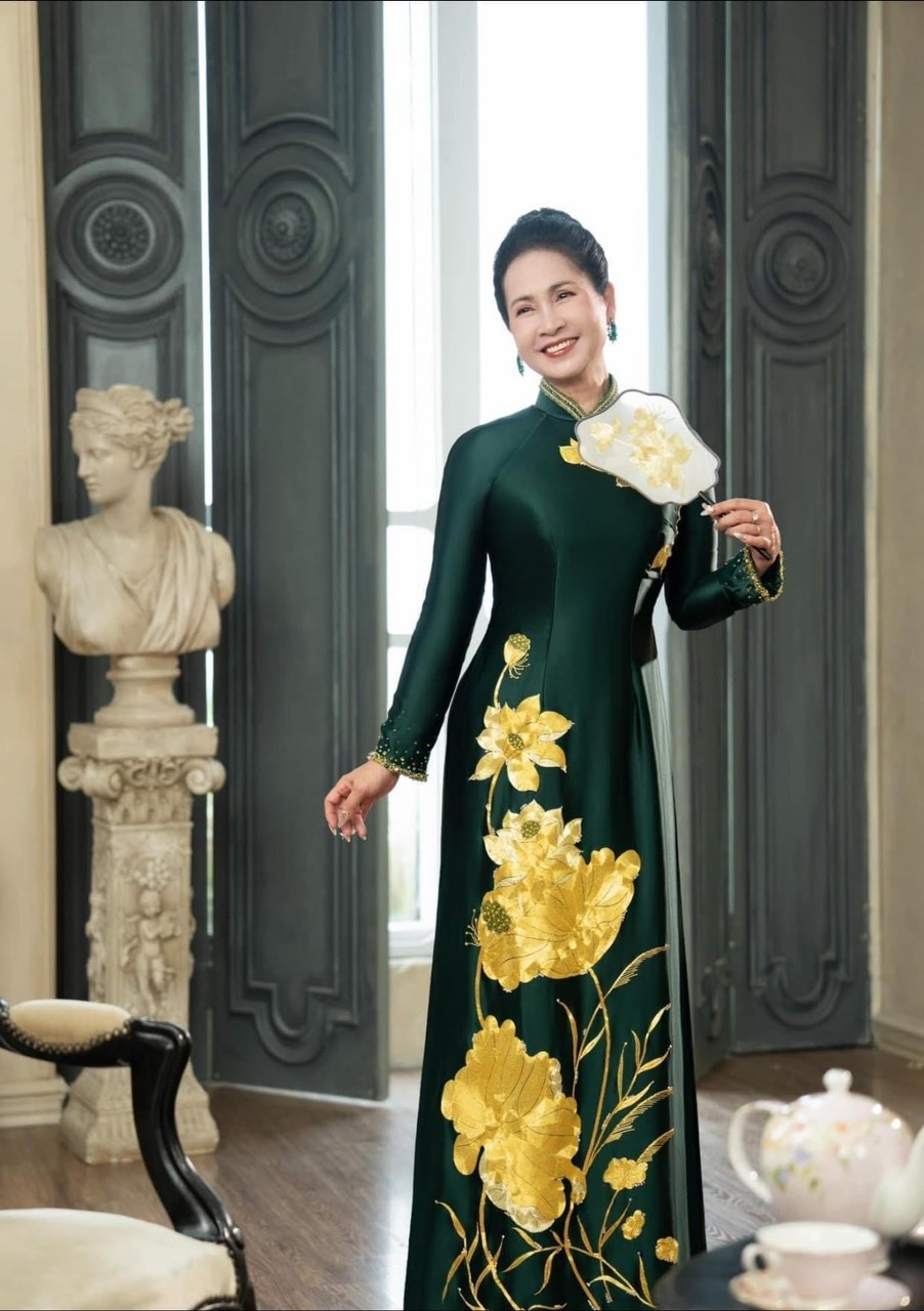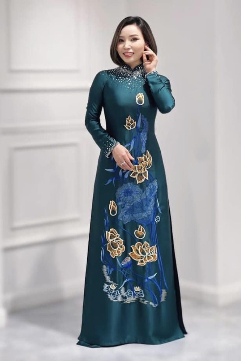 Nếu bạn muốn tạo điểm nhấn sang trọng mà không quá cầu kỳ, hãy thử các mẫu áo dài đính đá nhẹ hoặc thêu tay thủ công. Các chi tiết thêu hoa sen, hoa mẫu đơn, hoặc họa tiết truyền thống được xử lý khéo léo sẽ mang lại vẻ quý phái, chỉn chu cho người mẹ.