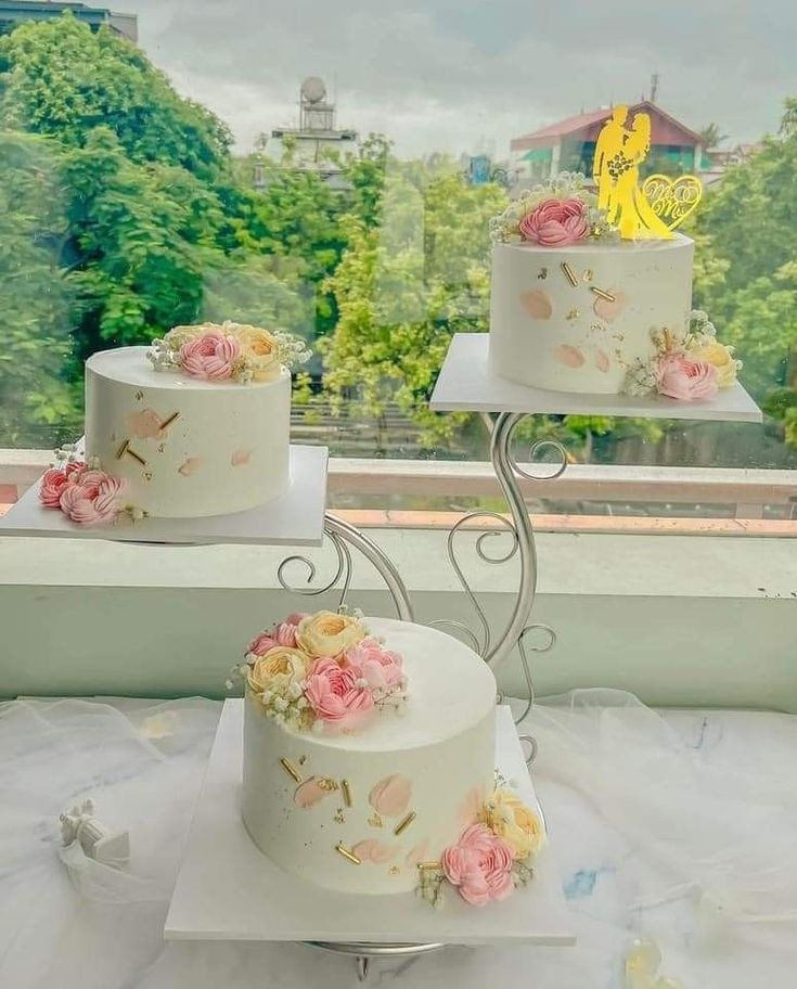 Trang trí hoa tươi, chi tiết ánh kim hay phủ fondant đều có thể mang đến vẻ ngoài lộng lẫy, phù hợp với nhiều phong cách tiệc cưới.