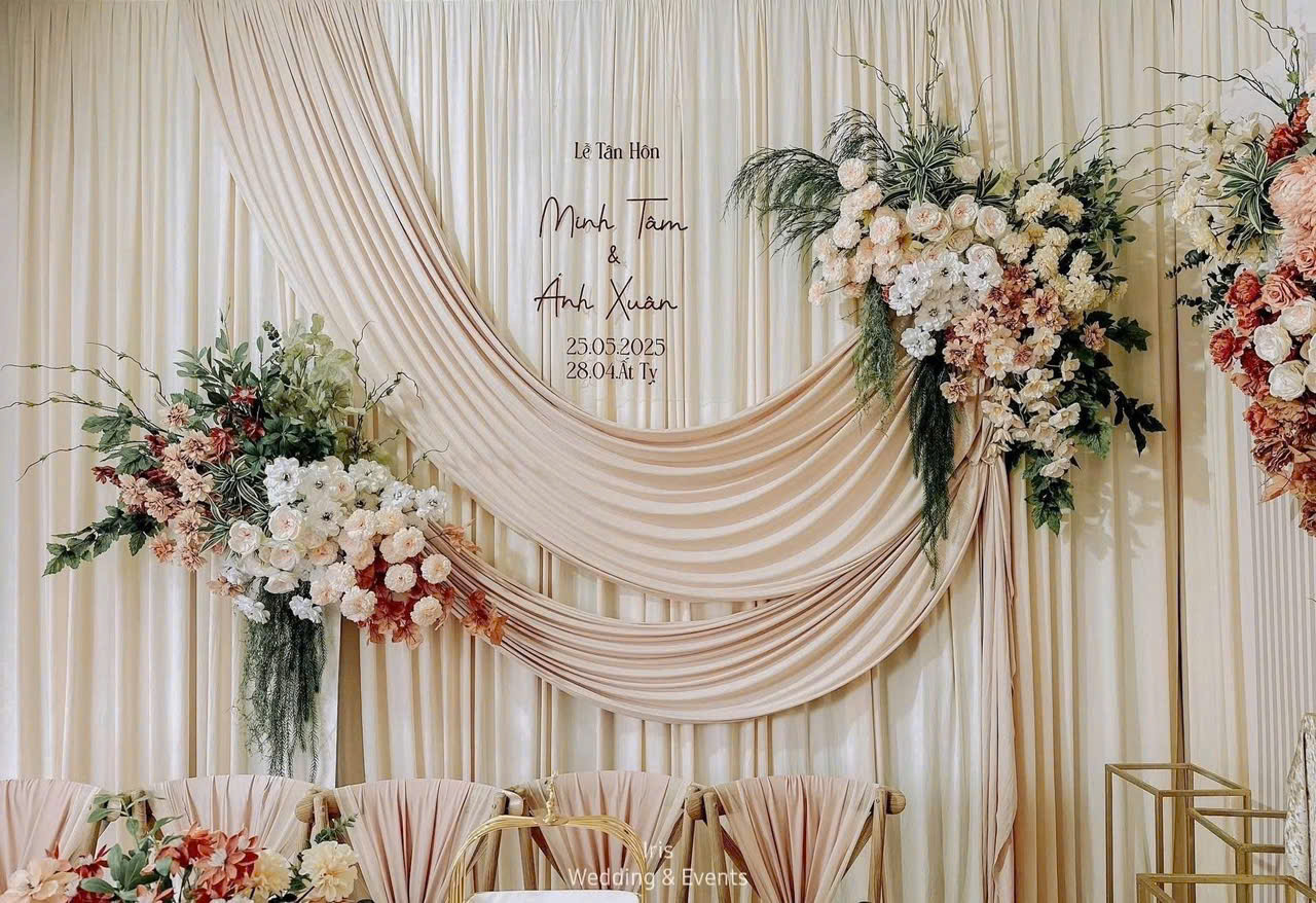 Phông ăn hỏi tone trắng – kem – nude được yêu thích nhờ phong cách thanh lịch, tinh tế và dễ ứng dụng. Màu sắc trung tính giúp phông ăn hỏi dễ phối với áo dài cô dâu chú rể, đồng thời tạo cảm giác nhẹ nhàng, sang trọng, phù hợp với nhiều không gian tổ chức khác nhau.