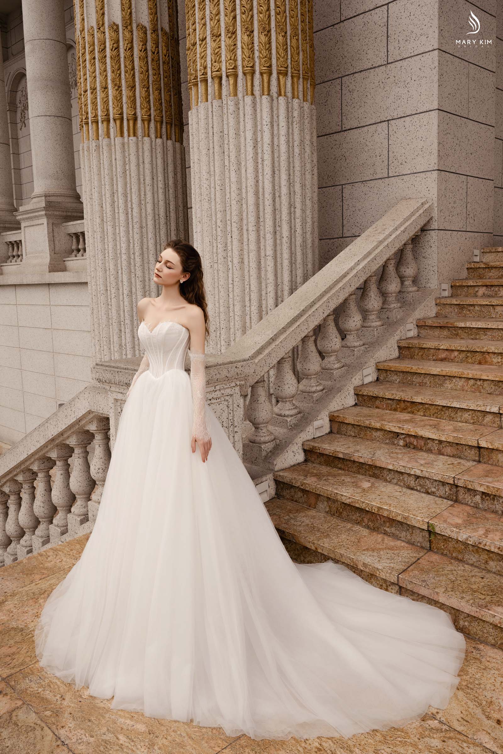 Với thiết kế tùng váy xòe rộng, phần thân trên ôm sát, váy cưới cổ điển công chúa mang đến vẻ đẹp ngọt ngào, lãng mạn. Chi tiết ren, hoa thêu tay và cổ áo thuyền là những điểm nhấn đặc trưng của kiểu váy này.