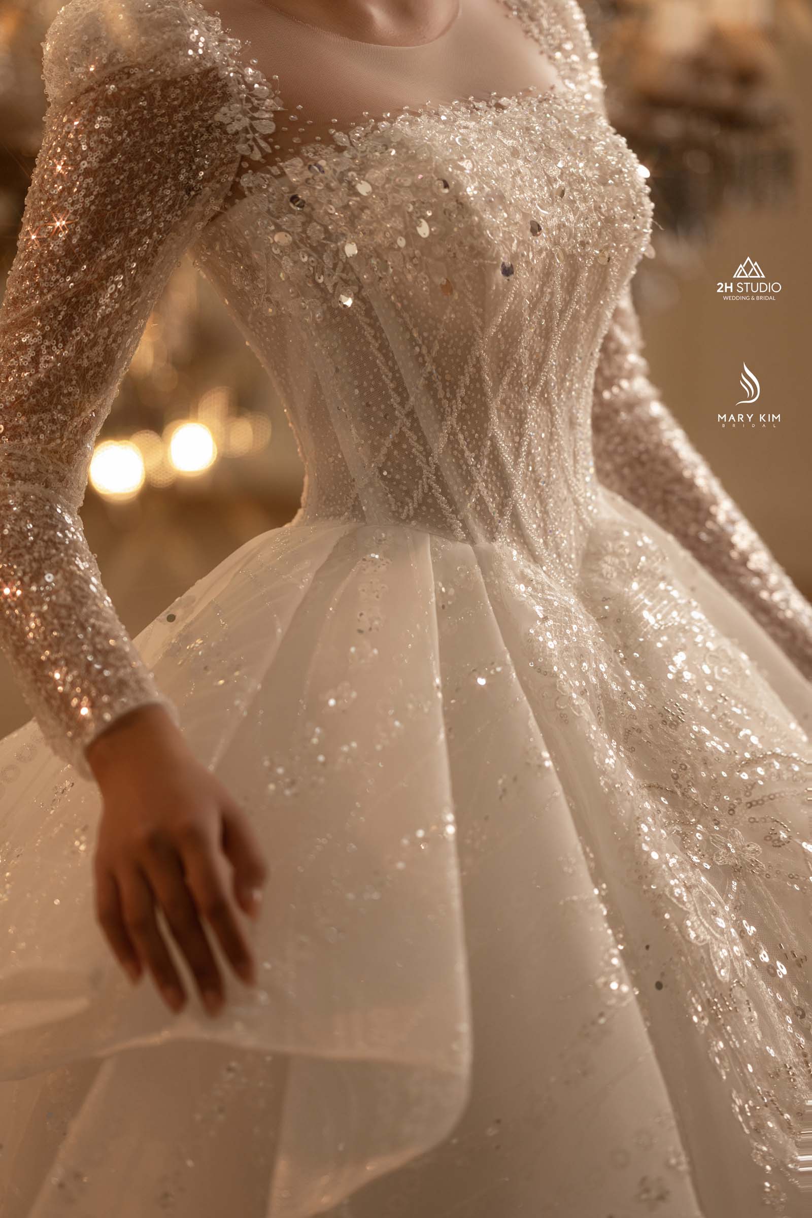 Váy cưới mùa đông đẹp nhất là khi nó gợi được cảm giác ấm áp, sang trọng và lấp lánh. Các chi tiết thêu tay, đính hạt pha lê hay ren ánh kim sẽ phản chiếu ánh sáng nhẹ nhàng, tạo hiệu ứng lung linh đặc trưng của mùa lạnh.