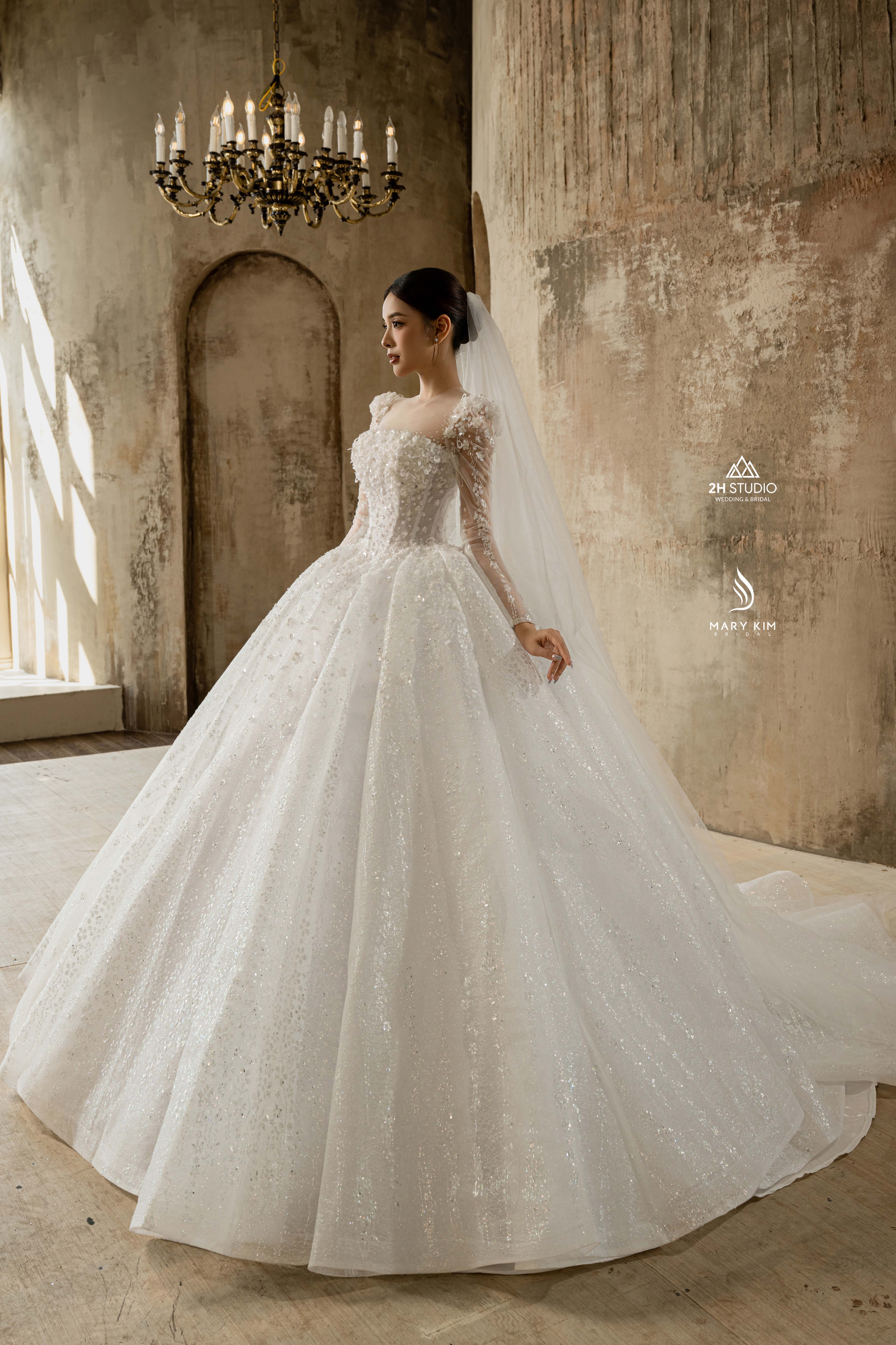 Mẫu váy dáng công chúa với tay phồng nhẹ tạo điểm nhấn cổ điển và kiêu kỳ. Thân váy đính kết tinh xảo, chân váy xòe lớn lấp lánh giúp cô dâu nổi bật như nàng công chúa trong ngày cưới. Thiết kế phù hợp với những nàng dâu yêu sự lộng lẫy và đầy cuốn hút.