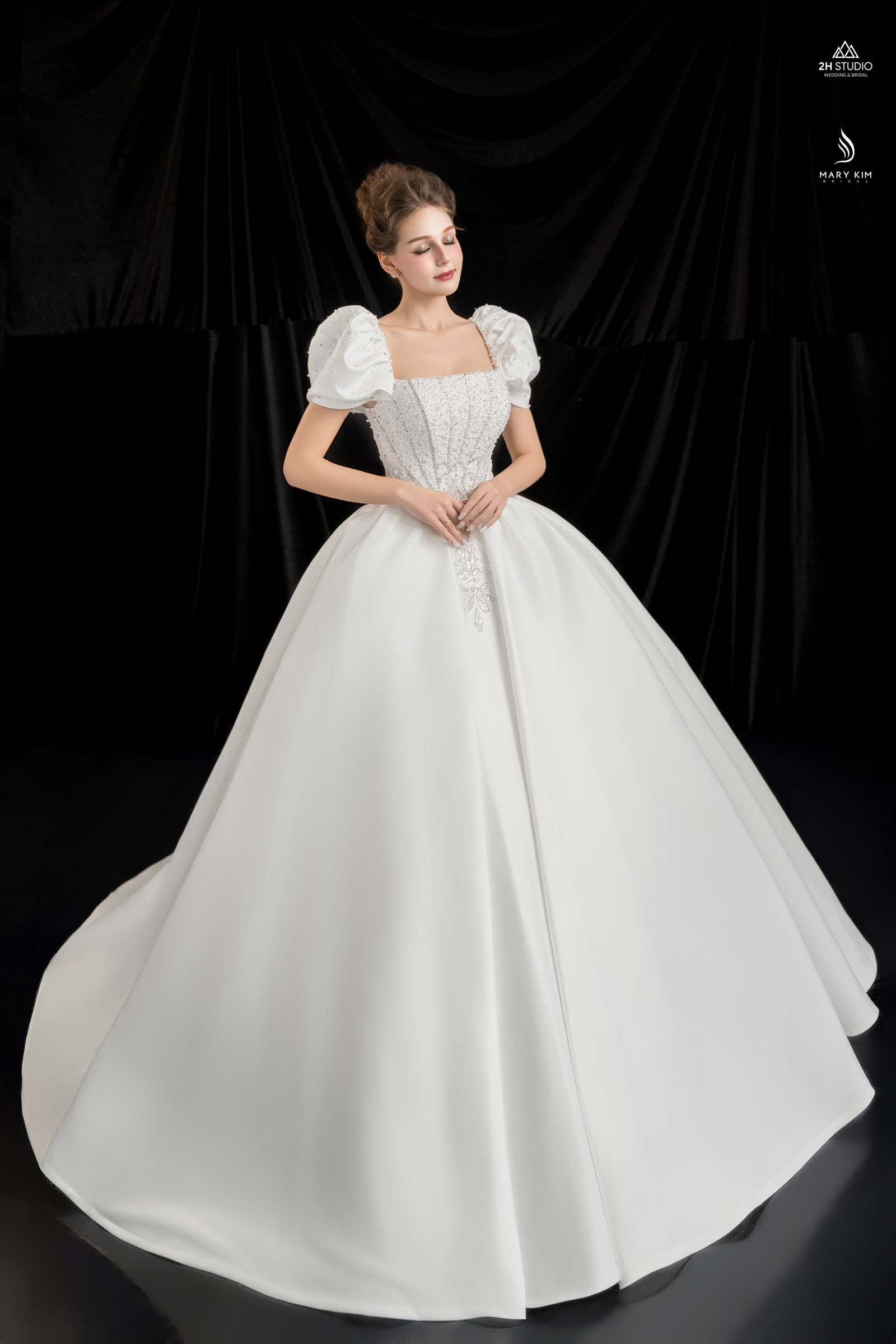 2H STUDIO tự hào cung cấp các mẫu váy cưới tay phồng cao cấp, lấy cảm hứng từ những thiết kế cổ điển hoàng gia, mang đến vẻ lộng lẫy và sang trọng cho cô dâu. Phong cách tay phồng vintage tại 2H STUDIO nổi bật với chi tiết tay áo bồng bềnh tinh tế, kết hợp chất liệu cao cấp như voan, satin và ren, tạo cảm giác thoải mái nhưng vẫn đầy quý phái.