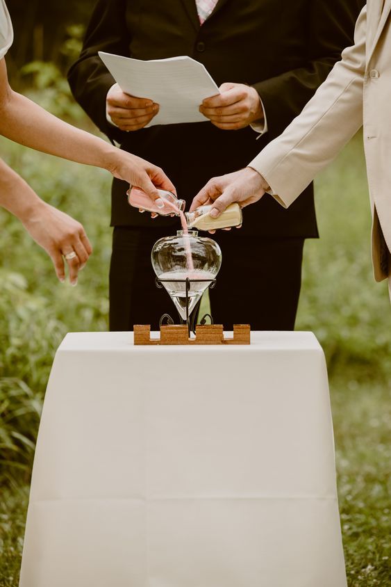 Nghi thức “Rót Cát Hợp Hôn” là một biểu tượng tinh tế và sâu sắc trong lễ cưới hiện đại, thể hiện sự hòa quyện và gắn bó bền chặt giữa hai con người. Khi cô dâu và chú rể cùng nhau đổ cát từ hai bình riêng biệt vào một bình lớn, hành động này tượng trưng cho việc hai cá thể khác biệt kết hợp thành một thể thống nhất, không thể tách rời.