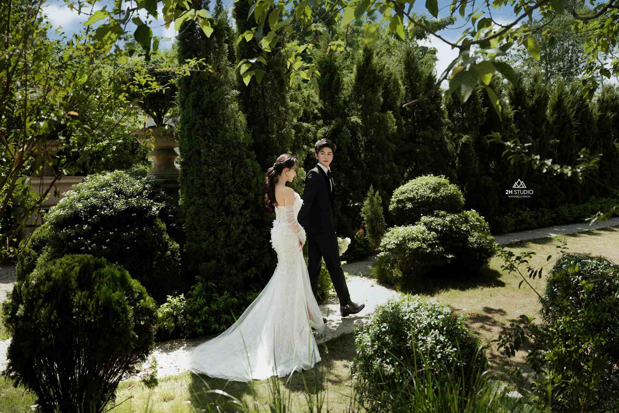 Góc chụp cưới với vườn cây lãng mạn