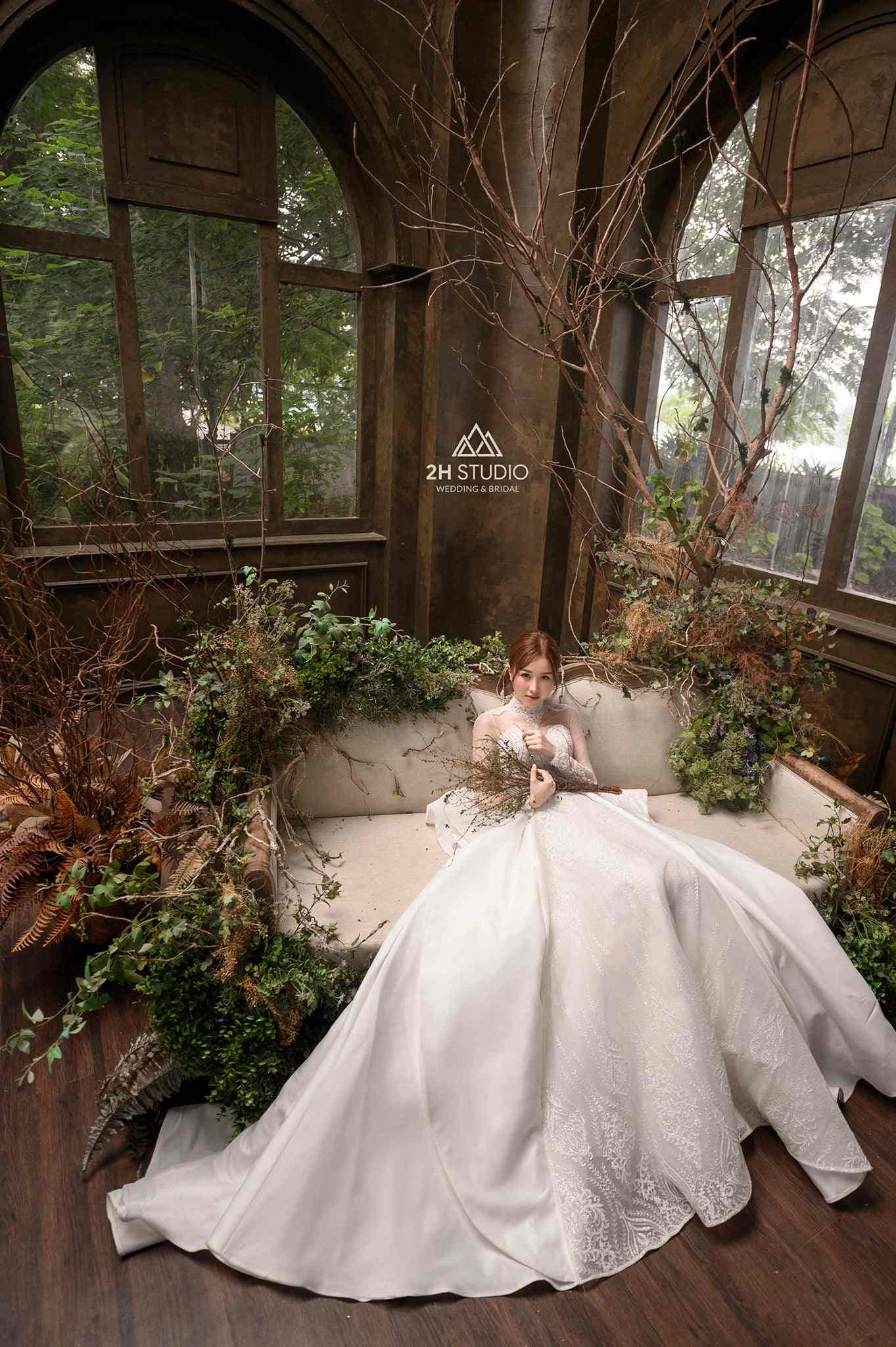 Những cây cối xanh mát, dây leo, và cây bụi nhỏ tạo nên một không gian thư giãn, giúp bộ ảnh thêm phần tự nhiên và tươi mới.
