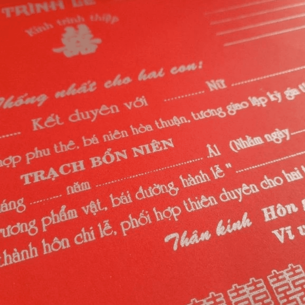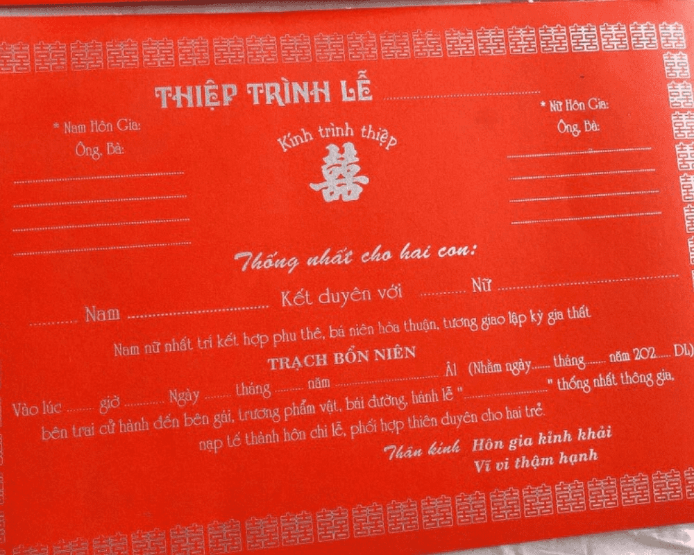 Thiệp trình ngày cưới, còn được gọi là giấy trình lễ cưới, là một nghi thức quan trọng trong văn hóa cưới hỏi của người Việt. Trong phong tục truyền thống, thiệp trình không đơn thuần là một tờ giấy thông báo mà còn mang ý nghĩa nghi lễ sâu sắc. Đây là bước thể hiện sự chu đáo, trang nghiêm trong quá trình chuẩn bị hôn sự, đồng thời là cầu nối gắn kết hai gia đình, thể hiện sự đồng thuận và kính trọng lẫn nhau trước khi tiến hành lễ cưới.