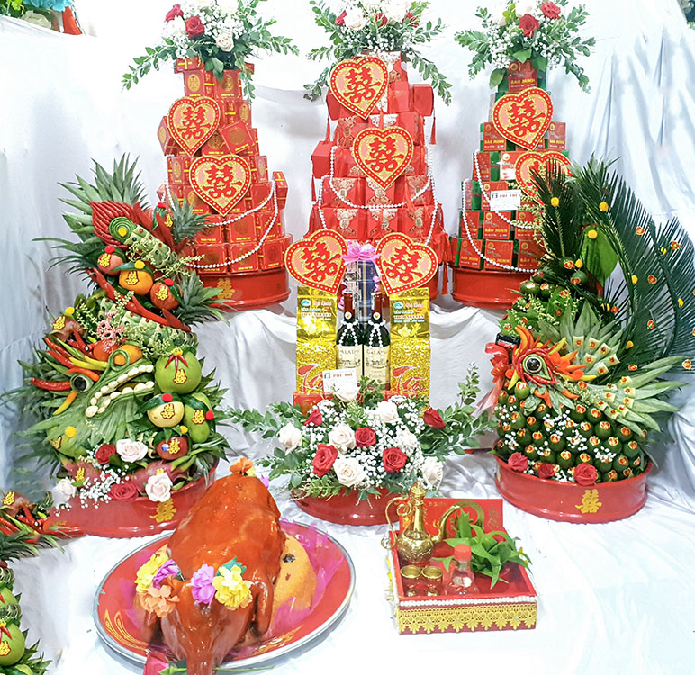 Mâm ngũ quả được kết thành hình long phục, biểu tượng cho sự sum vầy, hạnh phúc và trọn vẹn của đôi bạn trẻ. Hoa tươi thường được chọn là hoa loa kèn, hoa lay ơn, …