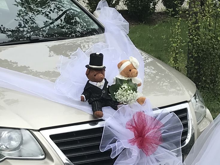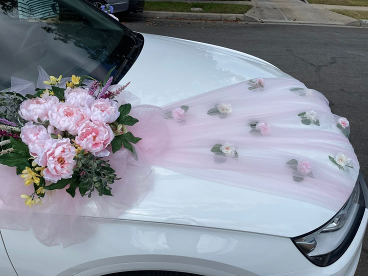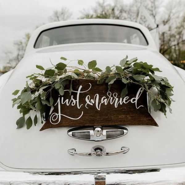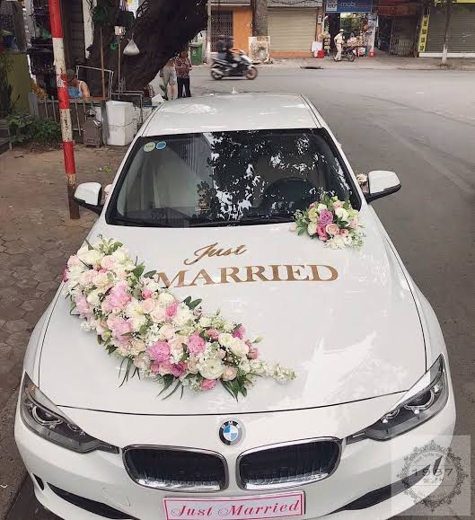 Thay vì chỉ dùng hoa, bạn có thể thêm các phụ kiện như bảng tên cô dâu – chú rể, mô hình búp bê cưới, vòng hoa treo sau xe, hoặc bảng hiệu “Just Married”. Cách trang trí xe hoa cưới này tạo điểm nhấn vui tươi và khác biệt, đặc biệt phù hợp với những cặp đôi trẻ trung, cá tính muốn thể hiện dấu ấn riêng trong ngày trọng đại.
