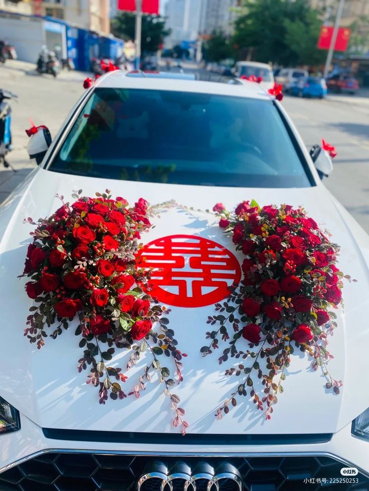 Trang trí xe hoa màu đỏ tượng trưng cho hạnh phúc, viên mãn và may mắn. Hoa hồng đỏ hoặc lan đỏ được kết cầu kỳ ở đầu xe, phối với ruy băng vàng hoặc trắng tạo điểm nhấn rực rỡ. Đây là lựa chọn phổ biến trong các đám cưới truyền thống Việt Nam, mang ý nghĩa tốt lành cho cặp đôi.
